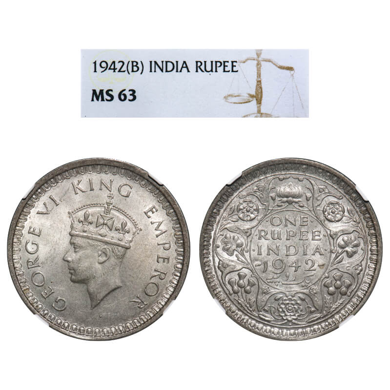 George VI, Half Silver, Rupee, 1942, Bombay Mint, B(a)/II, Diamond, Security edge. F. Prid 240. GK 1264. NGC Slabbed MS 63. Very Rare.