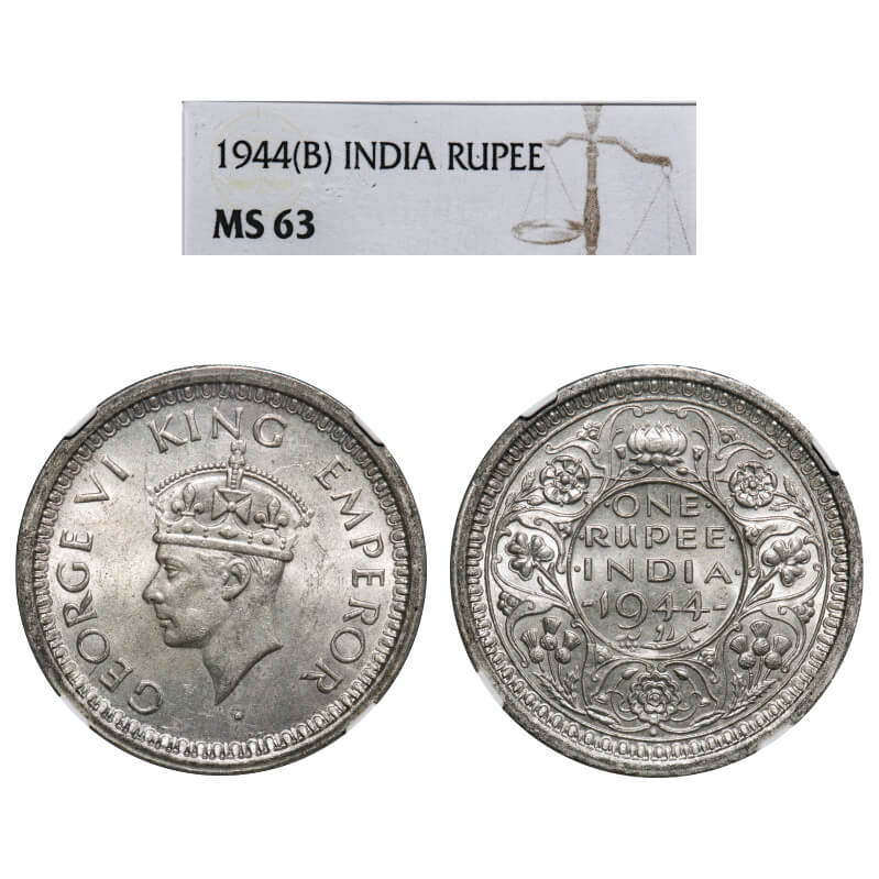 George VI, Half Silver, Rupee, 1944, Bombay Mint, D/II, Dot, Security edge. F. Prid 245. GK 1280. NGC Slabbed MS 63. Very Rare.
