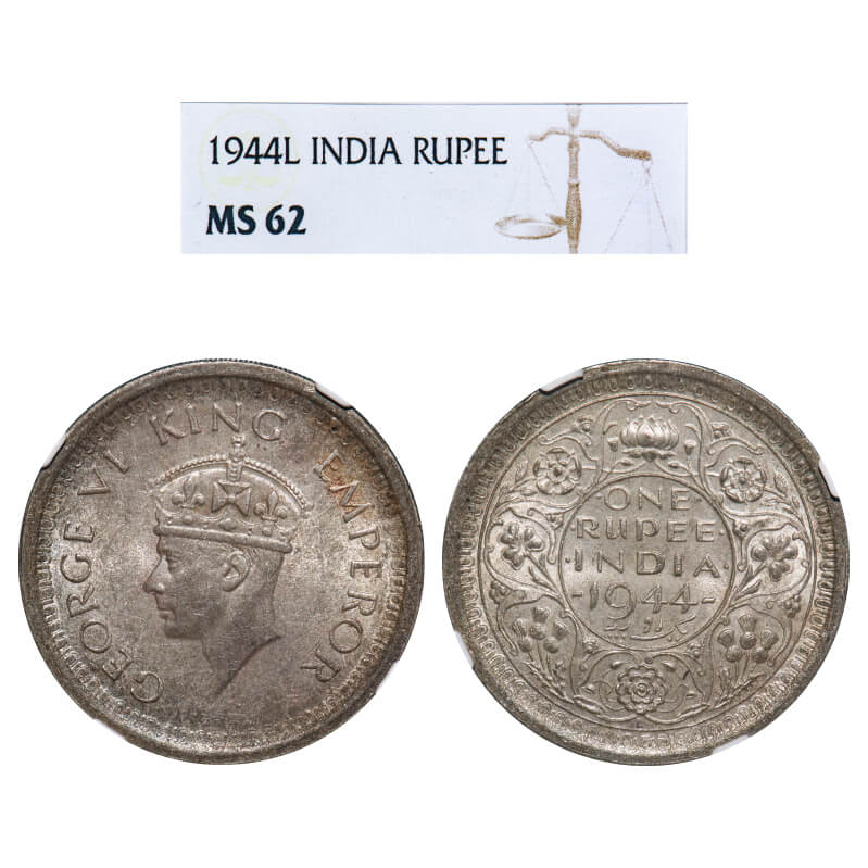 | George VI, Half Silver, Rupee, 1944, Lahore Mint, D/II, 'L' raised, Security edge, Thin 'L'. F. Prid 247. GK 1282. NGC Slabbed MS 62. Very Rare. |