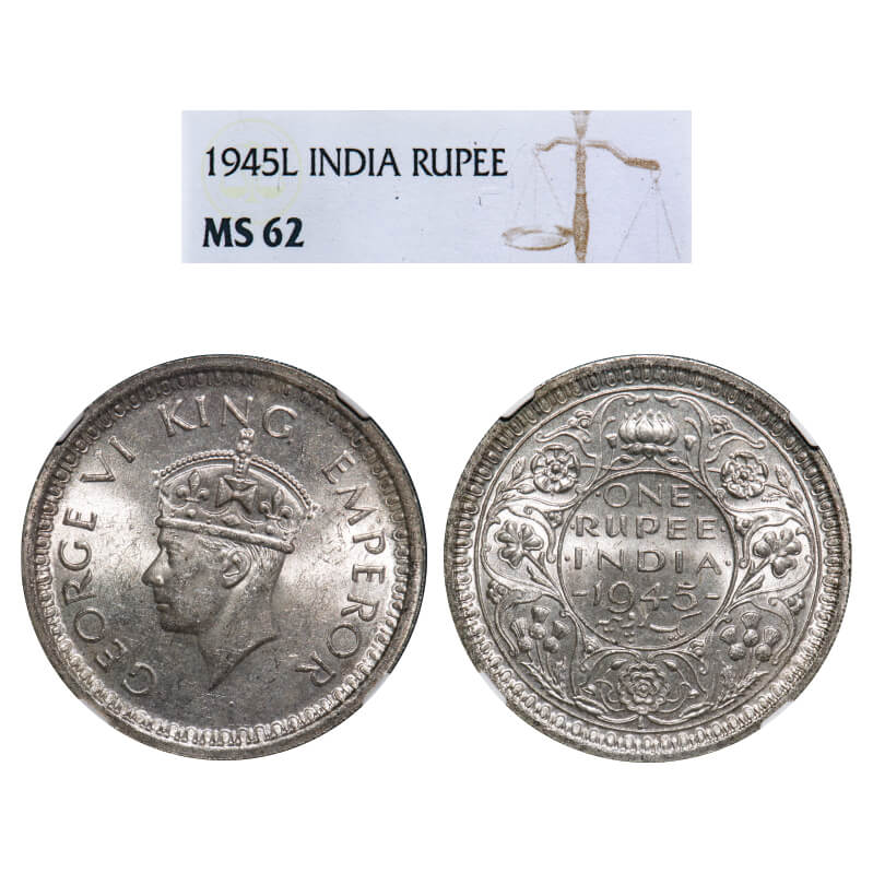 | George VI, Half Silver, Rupee, 1945, Lahore Mint, D/II, 'L' raised, Security edge, Normal 5, Thick 'L'. F. Prid 248. GK 1288. NGC Slabbed MS 62. Very Rare. |