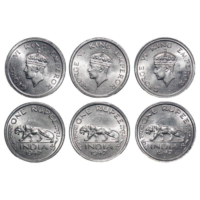 | George VI, Nickel, Rupee, 1947, (3 coins), Bombay Mint, E/IV, Diamond, Security edge, 1) Small Diamond, 2 & 3) Normal Diamond. F. Prid 865, 865(2). GK 1291, 1292(2). Almost Uncirculated to Uncirculated. Scarce. |