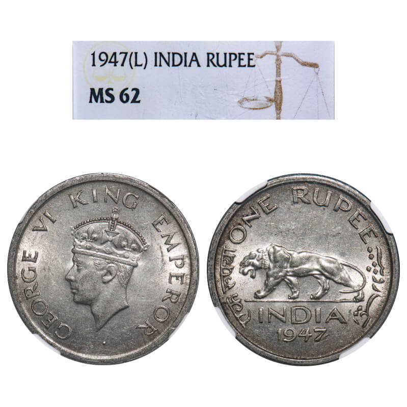 George VI, Nickel, Rupee, 1947, Lahore Mint, E/IV, No mint mark, Security edge. F. Prid 864. GK 1293. NGC Slabbed MS 62. Rare.