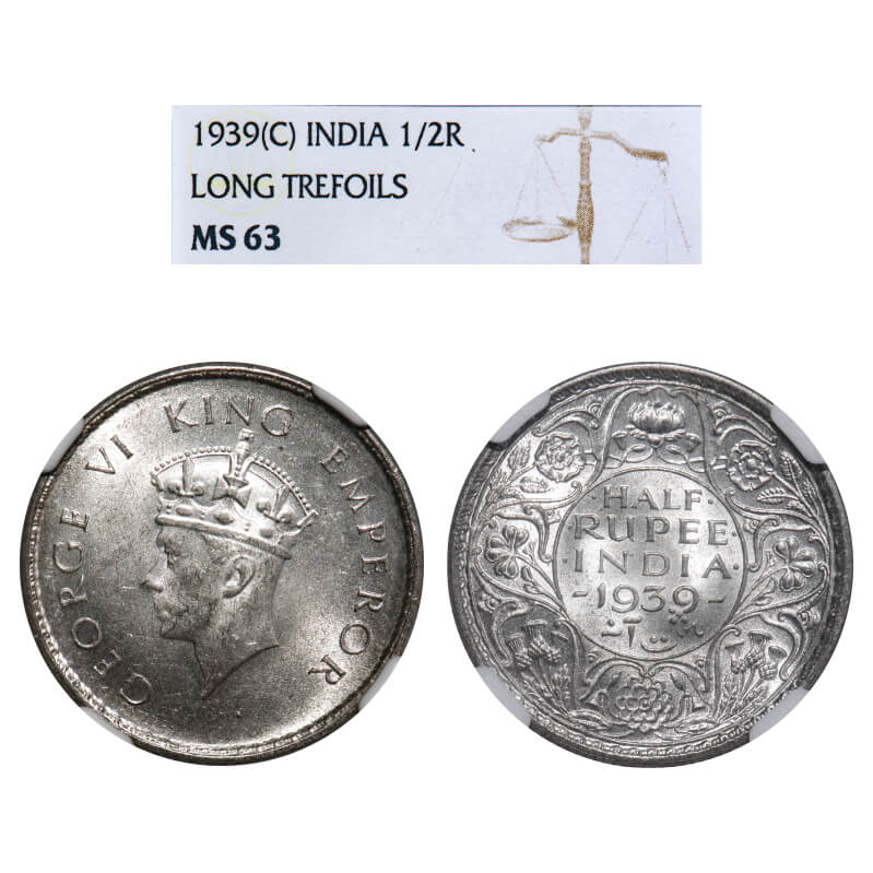 | George VI, Silver, Half Rupee, 1939, Calcutta Mint, A/I, No dot, Head Type I, Milled edge. F. Prid 363. GK 1297. NGC Slabbed MS 63. Very Rare. |