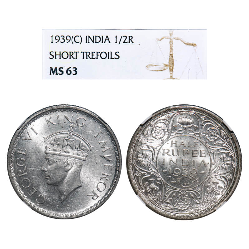 | George VI, Half Silver, Half Rupee, 1939, Calcutta Mint, A(a)/I, No dot, Head Type II, Milled edge. F. Prid 364. GK 1298. NGC Slabbed MS 63. Very Rare. |