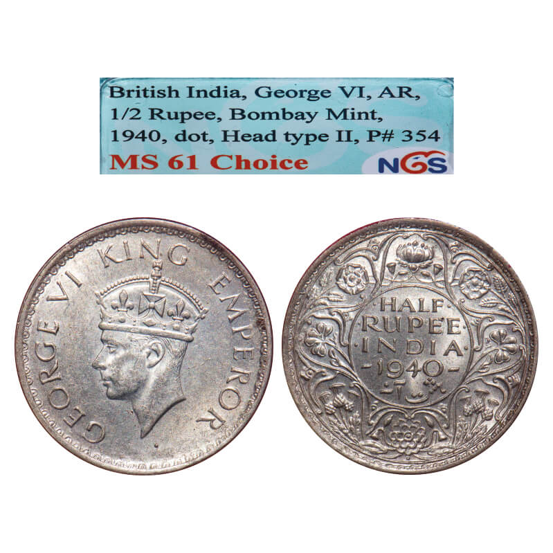 George VI, Half Silver, Half Rupee, 1940, Bombay Mint, A(a)/I, Dot, Head Type II, Milled edge. F. Prid 354. GK 1299. NGS Slabbed MS 61 Choice. Rare.