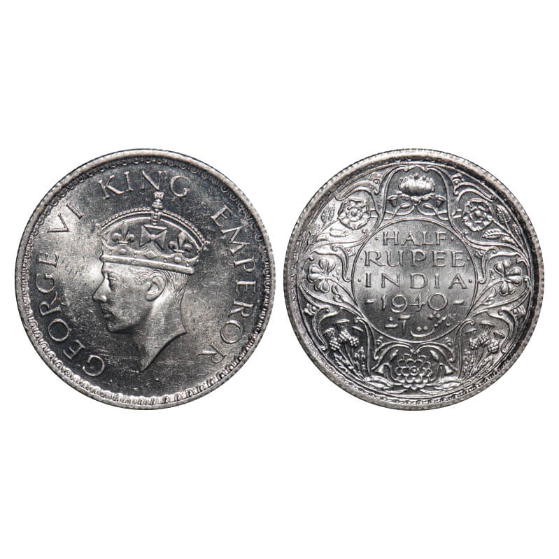 George VI, Half Silver, Half Rupee, 1940, Calcutta Mint, A(a)/I, No dot, Head Type II, Milled edge. F. Prid 365. GK 1300. Mint State. Rare.