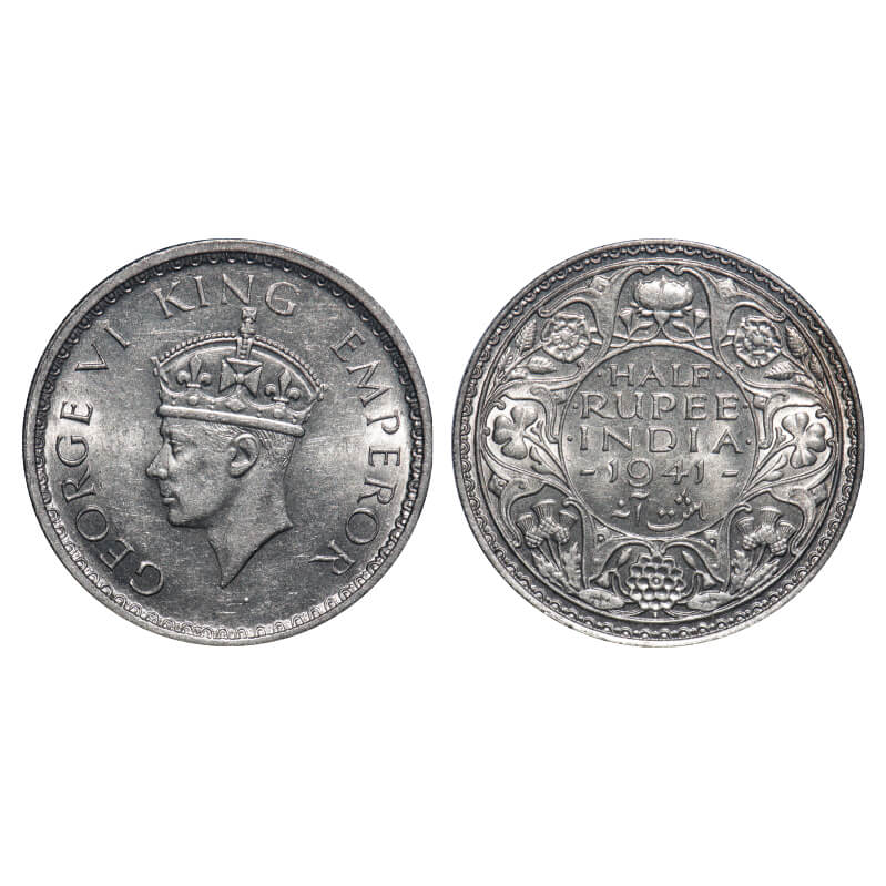 George VI, Half Silver, Half Rupee, 1941, Bombay Mint, A(a)/I(i), Dot, Head Type II, Security edge....