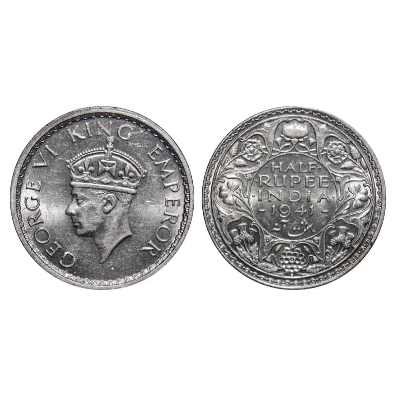 George VI, Half Silver, Half Rupee, 1941, Bombay Mint, A(a)/I(i), Dot, Head Type II, Security edge....