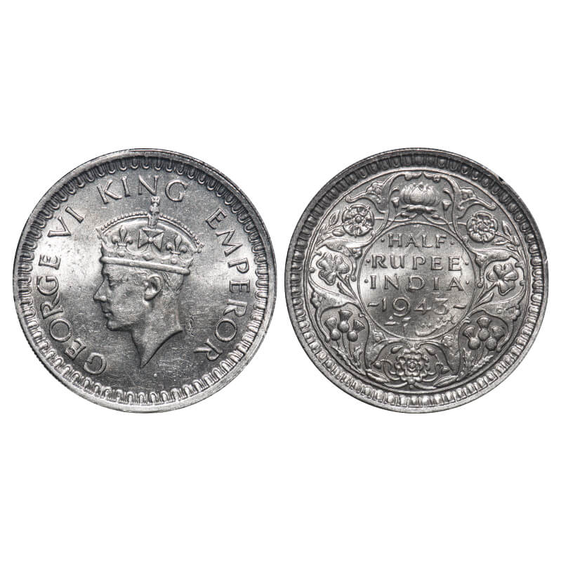 George VI, Half Silver, Half Rupee, 1943, Bombay Mint, B/II, Dot, Head Type II, Security edge. F. Prid 358. GK 1305. Uncirculated. Very Scarce.