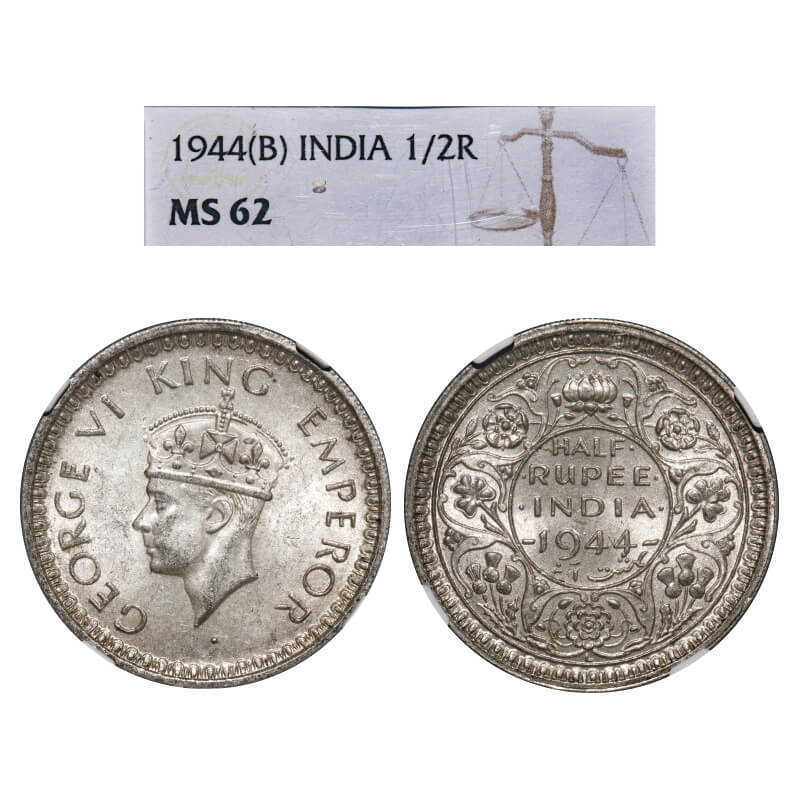 | George VI, Half Silver, Half Rupee, 1944, Lahore Mint, B/II, 'L' raised, Head Type II, Security edge. F. Prid Unlisted. GK 1314. NGC Slabbed MS 62. Very Rare. |