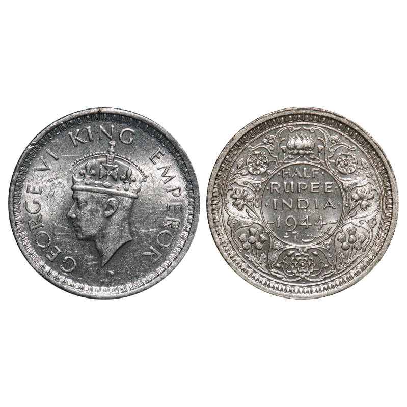 George VI, Half Silver, Half Rupee, 1944, Lahore Mint, B/II, 'L' raised, Head Type II, Security edg...