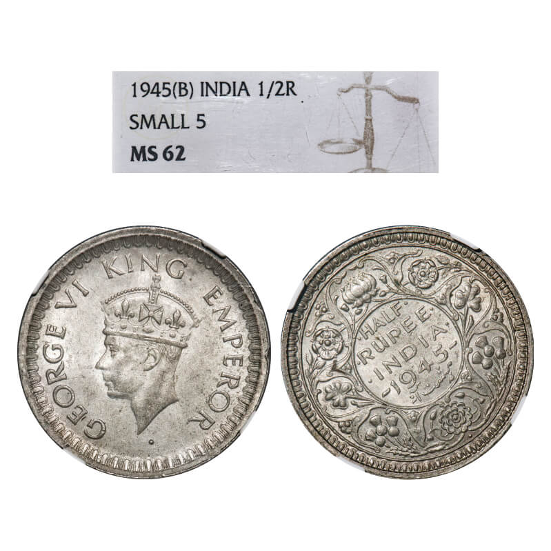 | George VI, Half Silver, Half Rupee, 1945, Bombay Mint, B/II, Dot, Head Type II, Security edge, Normal 5, Almost 11'o clock on Rev. F. Prid 361. GK 1316. NGC Slabbed MS 62. Very Rare. |