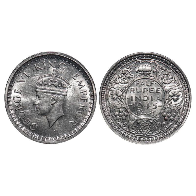 | George VI, Half Silver, Half Rupee, 1945, Bombay Mint, B/II, Dot, Head Type II, Security edge, Normal 5. F. Prid 361 . GK 1316. Uncirculated. Very Scarce. |