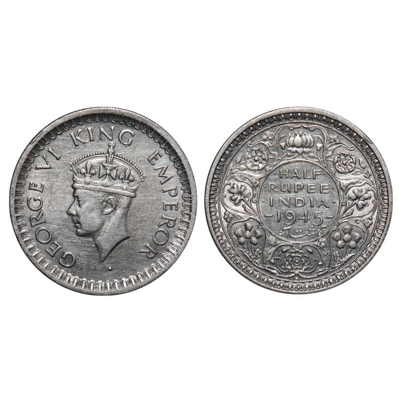 | George VI, Half Silver, Half Rupee, 1945, Bombay Mint, B/II, Dot, Head Type II, Security edge, Large 5. F. Prid 361. GK 1317. About Uncirculated. Very Rare. |