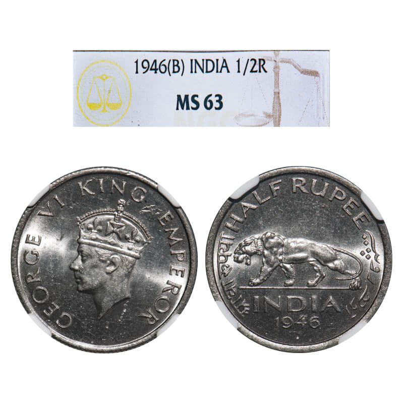 | George VI, Nickel, Half Rupee, 1946, Bombay Mint, C/IV, Diamond, Head Type II, Milled edge. F. Prid 866. GK 1321. NGC Slabbed MS 63. Very Rare. |