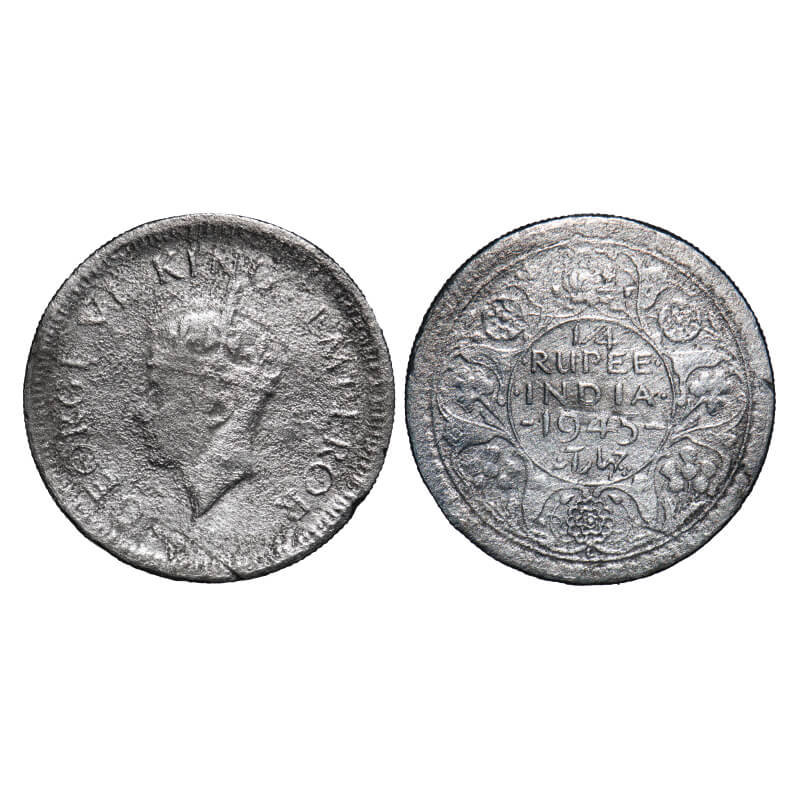 | George VI, Silver, 1/4 Rupee, 1945, Lahore Mint, 'L' raised, Head Type II, Rev II, Security edge, Large 5. F. Prid 479. GK 1345. Very Fine, Cleaned. Very Scarce. |