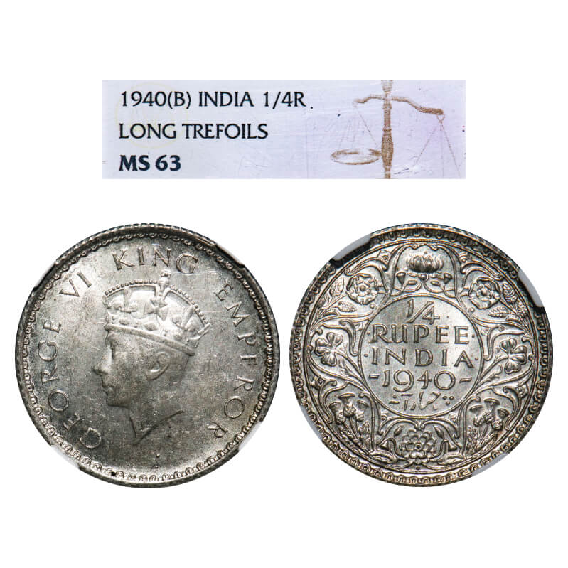 | George VI, Half Silver, 1/4 Rupee, 1940, Bombay Mint, Dot, Head Type I, Rev I, Milled edge. F. Prid 462. GK 1326. NGC Slabbed MS 63. Extremely Rare. |