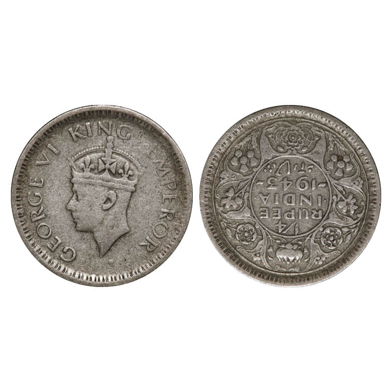 | George VI, Half Silver, 1/4 Rupee, 1943, Bombay Mint, Dot, Head Type II, Rev II, Security edge, Error Rev inverted. F. Prid 466. GK 1333. Very Fine. Extremely Rare. |