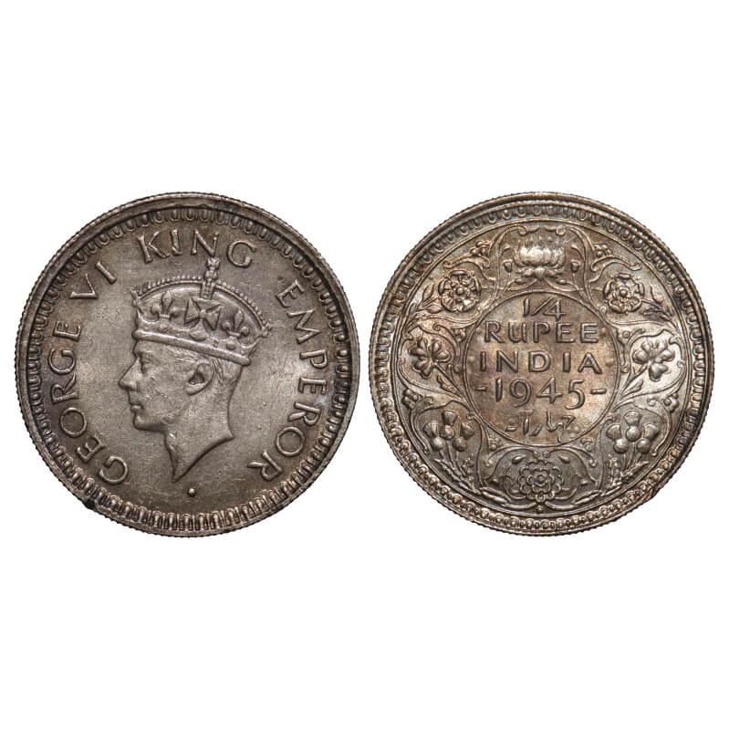 | George VI, Half Silver, 1/4 Rupee, 1945, Bombay Mint, Dot, Head Type II, Rev II, Security edge, Large 5. F. Prid 470. GK 1343. About Uncirculated, Toned Rev. Rare. |