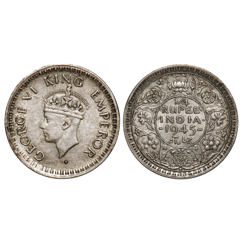 | George VI, Half Silver, 1/4 Rupee, 1945, Bombay Mint, Dot, Head Type II, Rev II, Security edge, Large 5. F. Prid 470. GK 1343. Extremely Fine+. Very Scarce. |