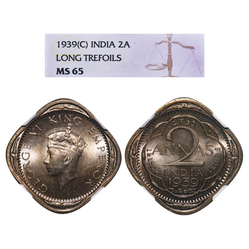 George VI, Copper-Nickel, 2 Annas, 1939, Calcutta Mint, No dots by year, Head Type I. F. Prid 904. GK 1350. NGC Slabbed MS 65. Very Rare.