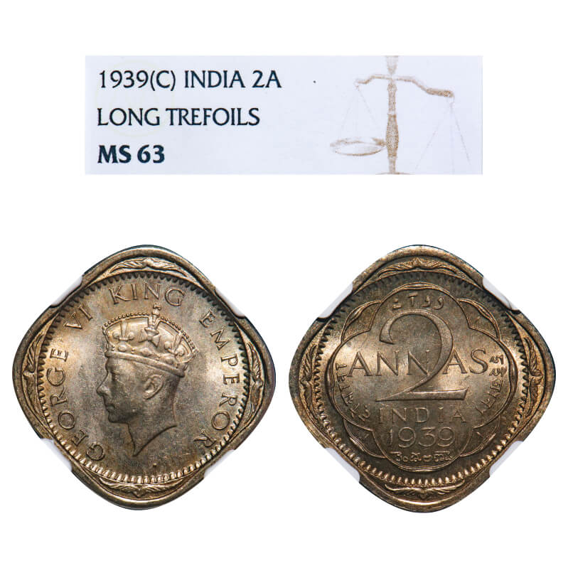 George VI, Copper-Nickel, 2 Annas, 1939, Calcutta Mint, No dots by year, Head Type I. F. Prid 904. GK 1350. NGC Slabbed MS 63. Very Rare.