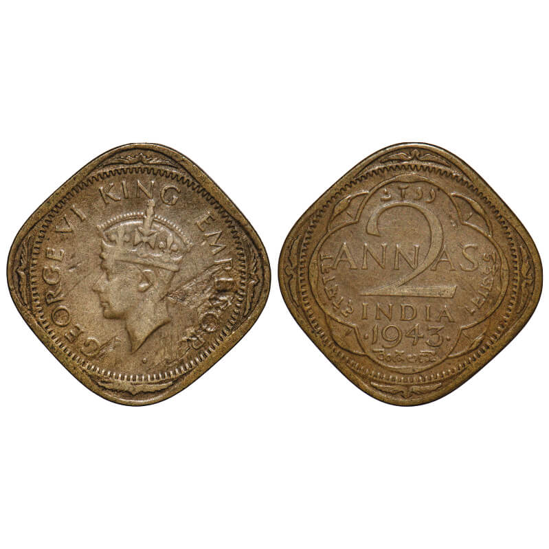 George VI, Nickel-Brass, 2 Annas, 1943, Bombay Mint, Dots by year, Head Type II, Planchat flaw on Obv. F. Prid 919. GK 1360. Very Fine+. Very Scarce.