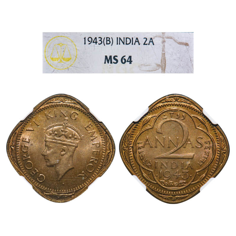 George VI, Nickel-Brass, 2 Annas, 1943, Bombay Mint, Dots by year, Head Type II. F. Prid 919. GK 1361. NGC Slabbed MS 64. Very Rare.