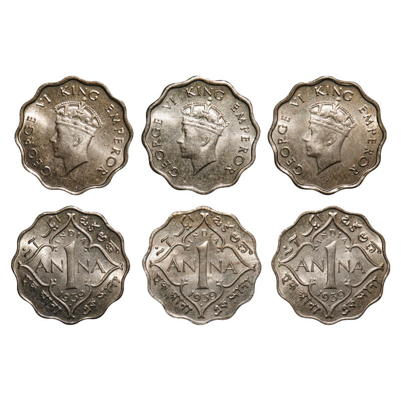 George VI, Copper-Nickel, 1 Anna, (3 coins), 1939, Bombay Mint, Dot, Head Type I. F. Prid 972(3). GK 1379(3). Brilliant Uncirculated. Very Scarce.