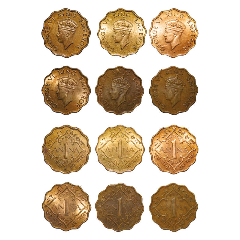 | George VI, Nickel-Brass, 1 Anna, (lot of 6 coins), 1 & 2) 1942, Bombay Mint, Dot, Head Type II, 3) 1943, Bombay Mint, Dot, Head Type II, Large numeral 3, 4) 1944, Bombay Mint , Dot, Head Type II, 5) 1944, Calcutta Mint, No dot, Head Type II, 6) 1945, Calcutta Mint, No dot, Head Type II, Top stroke of numeral 5 short. F. Prid 976(2), 977, 978, 966. GK 1388(2), 1391, 1393, 1394. Extremely Fine to Brilliant Uncirculated. Scarce as a lot |