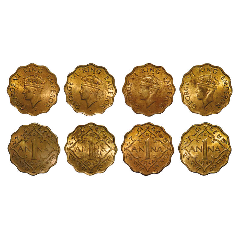 George VI, Copper-Nickel, 1 Anna, (4 coins), 1943(2) 1944(2), Bombay Mint, Dot, Head Type II. F. Prid 977(2), 978(2). GK 1391(2), 1393(2). Uncirculated. Scarce.