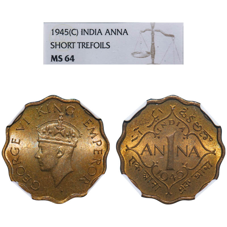 George VI, Nickel-Brass, 1 Annas, 1945, Calcutta Mint, No dot, Head Type II, Top stroke of numeral 5 short. F. Prid 967. GK 1396. NGC Slabbed MS 64. Very Rare.