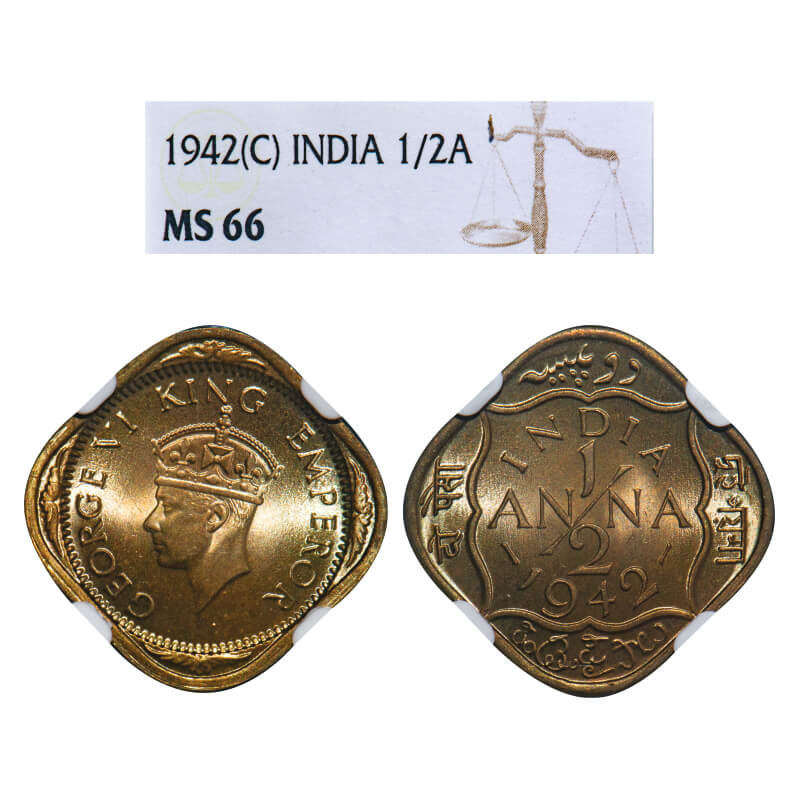 George VI, NIckel-Brass, 1/2 Anna, 1942, Bombay Mint, Dots by India, Dashes by year (Calcutta mint wrong mention on slab) . F. Prid . GK 1404. NGC Slabbed MS 66. Extremely Rare.
