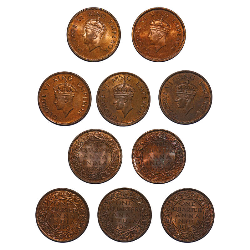 | George VI, Bronze, Quarter Anna, (lot of 5 coins), 1) 1938, Calcutta Mint, No dot, Head Type I, 2) 1939, Calcutta Mint, No dot, Head Type I, 3) 1940, Bombay Mint, Dot, Head Type II, 4) 1941, Calcutta Mint, No dot, Head Type II, 5) 1942, Calcutta Mint, No dot, Head Type II. F. Prid 684, 685, 692, 687, 688. GK 1421, 1423, 1426, 1429, 1431. Brilliant Uncirculated to Mint State. Scarce as a lot. |