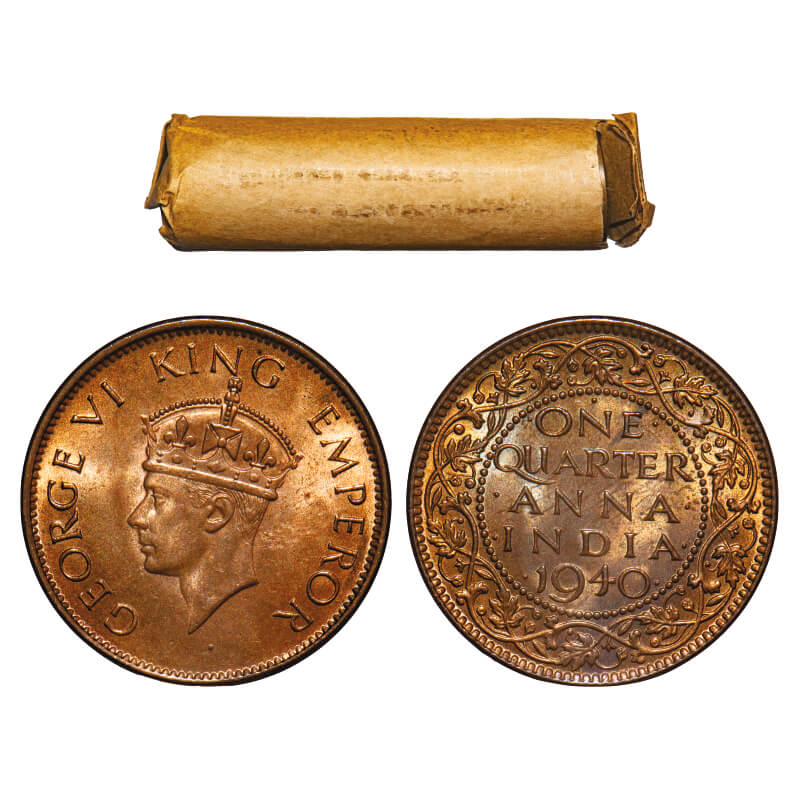 | George VI, Bronze, Quarter Anna, (Roll of 32 coins), 1940, Bombay Mint, Dot, Head Type II, 32 coins in immaculate Grades re rolled in a Brown paper roll from old broken paper roll. F. Prid 692. GK 1426. Rare. |