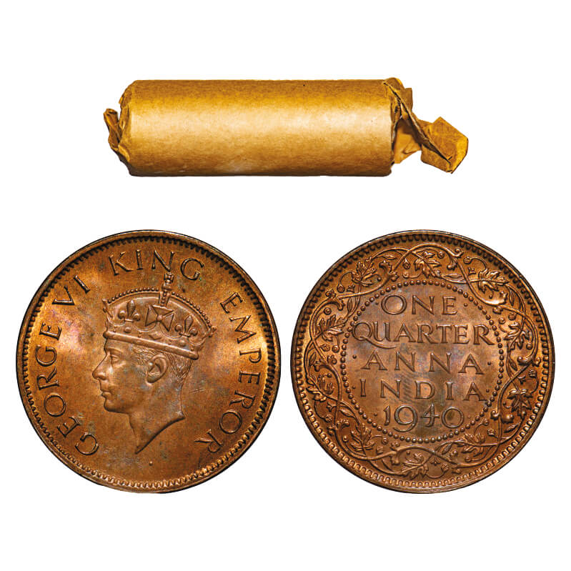 | George VI, Bronze, Quarter Anna, (Roll of 32 coins), 1940, Calcutta Mint, No dot, Head Type II, 32 coins in immaculate Grades re rolled in a Brown paper roll from old broken paper roll. F. Prid 686. GK 1427. Rare. |