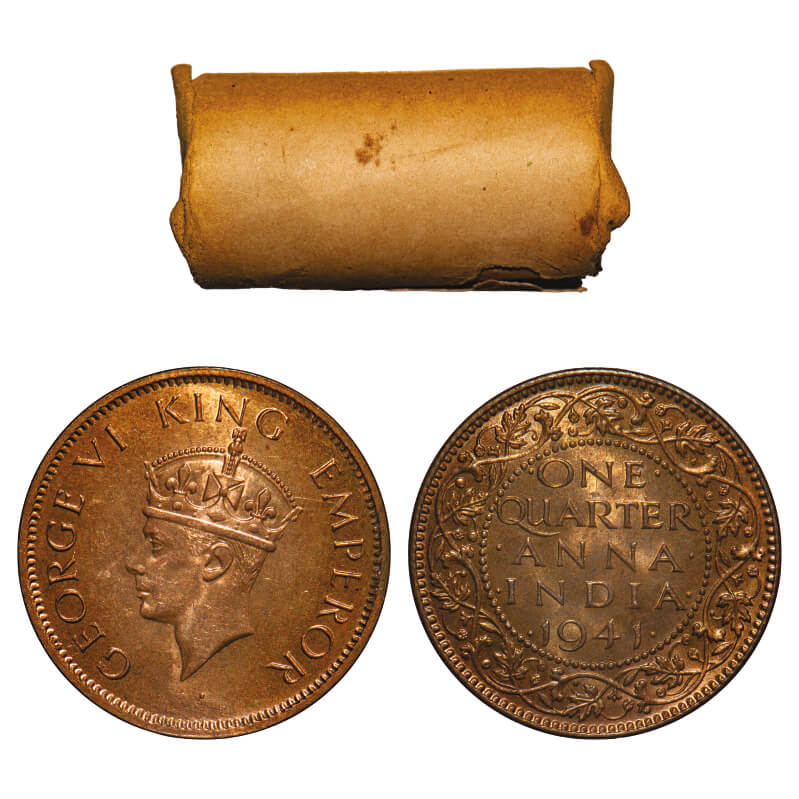 George VI, Bronze, Quarter Anna, (Roll of 32 coins), 1941, Calcutta Mint, No dot, Head Type II. 32 coins in immaculate Grades in a Brown paper roll. F. Prid 687. GK 1429. Rare.