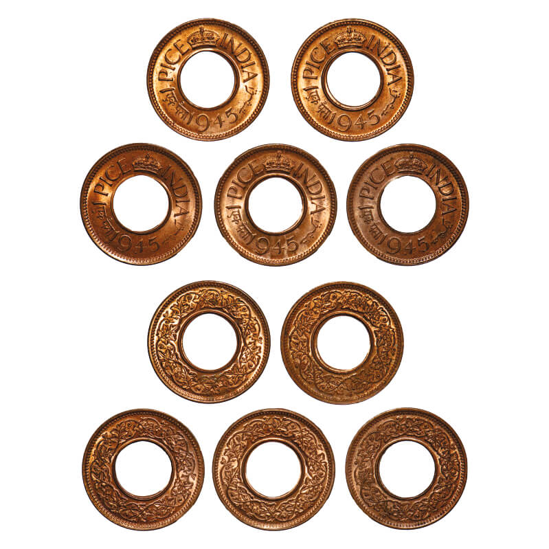 | George VI, Bronze, 1 Pice, (lot of 5 coins), 1) 1945, Bombay Mint, Dot, Flat Crown, 2 to 5) 1945, Calcutta Mint, No mint mark, Flat Crown. F. Prid 703, 696(4). GK 1443, 1445(4). Uncirculated to Briliiant Uncirculated. Scarce as a lot. |
