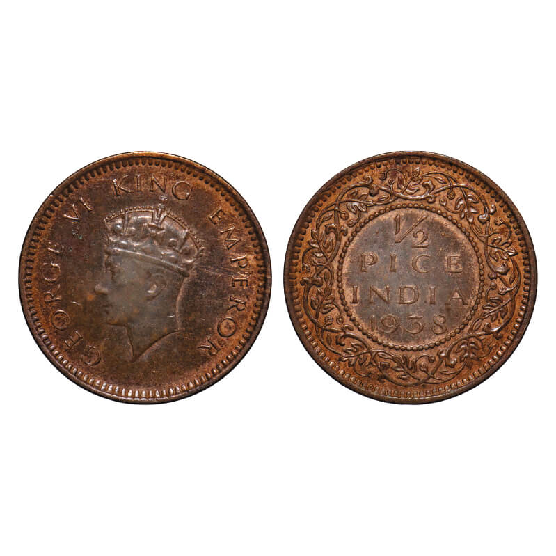 George VI, Bronze, 1/2 Pice, 1938, Calcutta Mint, No dot, Head Type I. F. Prid Unlisted. GK 1449. Uncirculated. Very rare.