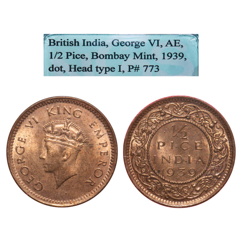 George VI, Bronze, 1/2 Pice, 1939, Bombay Mint, Dot, Head Type I. F. Prid 773. GK 1450. NGS Slabbed MS 62 BN Superb. Rare.