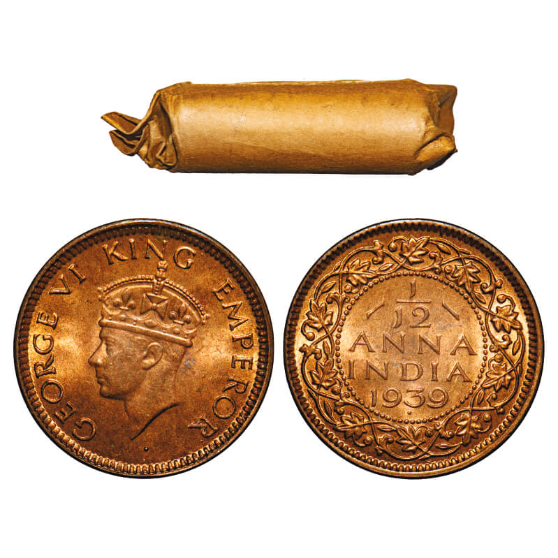 | George VI, Bronze, 1/12 Anna, (Roll of 24 coins), 1939, Bombay Mint, Dot, Head Type II, 24 coins in immaculate Grades in a Brown paper roll. F. Prid 861. GK 1454. Very Rare. |