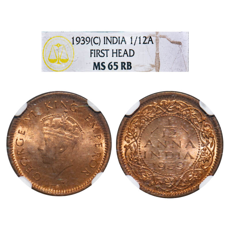 George VI, Bronze, 1/12 Anna, 1939, Calcutta Mint, No dot, Head Type I. F. Prid 859. GK 1455. NGC Slabbed MS 65 RB. Very Rare.