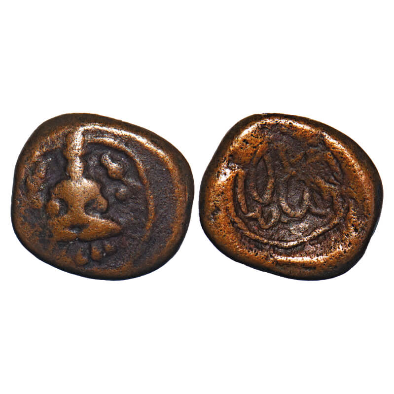 | Vijayanagar Feudatories, Madurai Nayakas, Virappa Nayaka, (1572-95 AD), Copper Kasu, 2.51g, 11.63x13.02 mm, Obv: Lakshmi seated frontally facing on a lotus, Circular border around, Rev: Telugu legend ‘Virapa’, Circular border around. Ref: Unlisted in major publications. Very Fine, Very Scarce. |