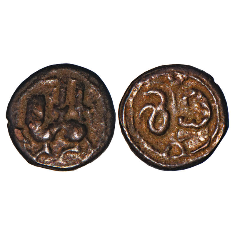 | Vijayanagar Feudatories, Madurai Nayakas, (16-18c AD), Copper Kasu fraction, 1.19g, 10.19x10.37 mm, Obv: Shiva-Parvati on bull to left, Circular border around, Rev: Telugu legend ‘Shri Vira’, Circular border around. Ref: Ganesh, Coins of Tamil Nadu, 5.65, pg. 76. Very Fine, Very Scarce. |