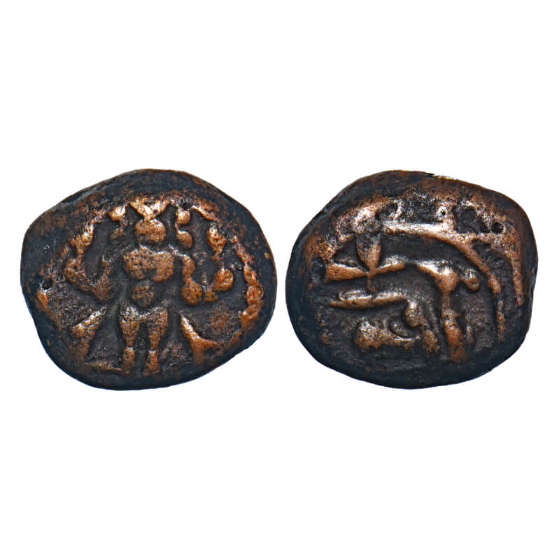 Vijayanagar Feudatories, Tanjavur Nayakas, (16-18c AD), Copper Kasu, 3.42g, 10.45x12.34 mm, Obv: Standing deity Vishnu holding Conch and Discus, Rev: Recumbent bull seated below Shiva Lingam. Ref: Ganesh, Coins of Tamil Nadu, 6.72. Very Fine. Scarce.