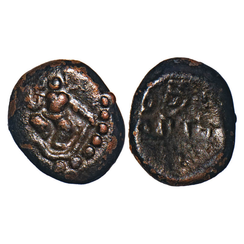 | Post Vijayanagar, Local Polygars, Govinda, (17-18c AD), Copper Kasu, 2.40g, 12.91x11.23 mm, Obv: Krishna trampling a snake (Kalinga-mardhana pose), Rev: Tamil legend ‘Govinda’. Very Fine, Very Scarce |