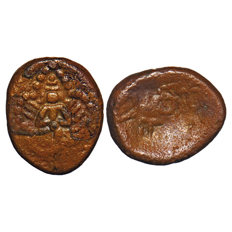 | Post Vijayanagar, Local Polygars, Ramana, (17-18c AD), Copper Kasu, 2.30g, 14.43x17.77 mm, Obv: Standing Garuda, facing front, with palms folded, within a decorative arch, Rev: Traces of Tamil legend ‘Ramana’. Ref: Unlisted in major publications. Very Fine, Very Scarce. |