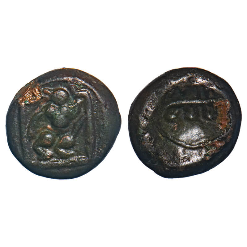 | Post Vijayanagar, Local Polygars, Ramana, (17-18c AD), Copper Kasu, 3.17g, 12.47x12.91 mm, Obv: Standing deity Hanuman, within an arched design, Rev: Tamil legend ‘Ramana’, Circular border around. Ref: Unlisted in major publications. Very Fine, Very Scarce. |