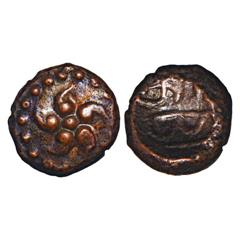| Post Vijayanagar, Local Polygars, Ramana, (17-18c AD), Copper Kasu, 2.31g, 11.14x11.78 mm, Obv: Flower with five petals, Dotted border around, Rev: Tamil legend ‘Ramana’, Circular border around. Ref: Unlisted in major publications. Very Fine, Very Scarce. |