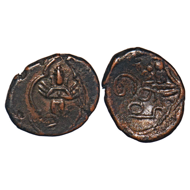 | Post Vijayanagar, Local Polygars, (17-18c AD), Copper Kasu, 2.16g, 13.39x16.21 mm, Obv: Standing Garuda, front facing, with hands folded, Rev: Tamil legend ‘Govi’. Very Fine, Very Scarce. |